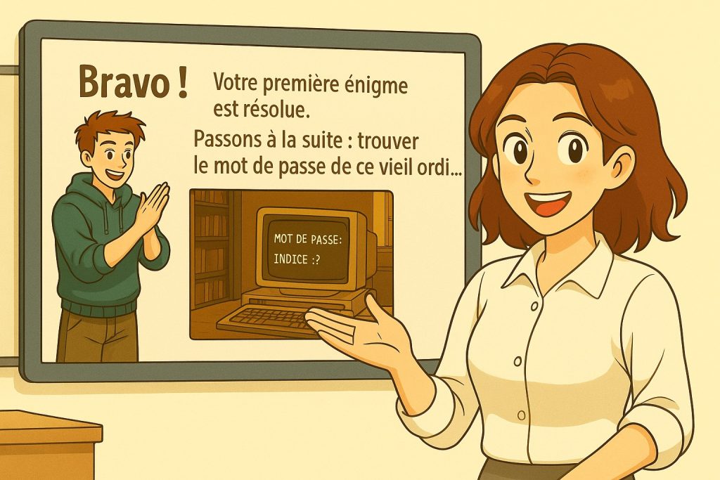 Pensé comme une expérience immersive, ce jeu d’évasion se déroule à la fois en classe et en virtuel grâce à un Genially interactif qui donne le rythme de l’aventure. La trame narrative est portée par l’interface numérique, tandis que les énigmes se résolvent directement dans la salle de classe.