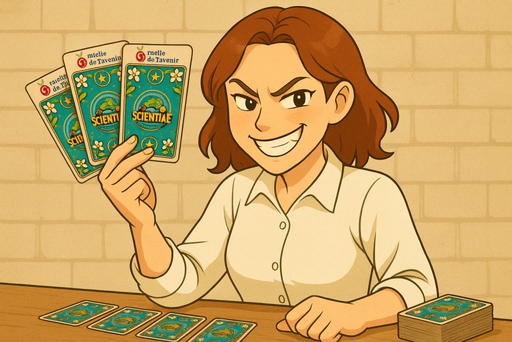 Scientiae est un jeu de cartes stratégique, pour 2 à 5 joueurs, qui vous plonge au cœur de l’histoire des sciences. Chaque joueur incarne une équipe de chercheurs et chercheuses tentant de réaliser des découvertes majeures en combinant : des scientifiques spécialisés dans différents domaines, des outils plus ou moins puissants, des découvertes de complexité variable.